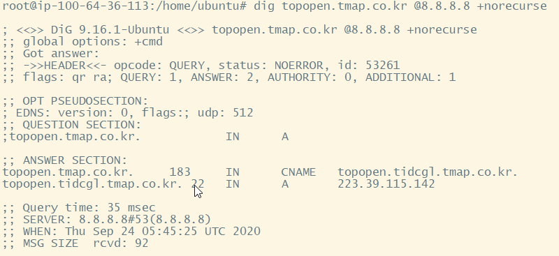 This is the other case, I will try dig to "8.8.8.8" which is google DNS server. Even if there are lots of DNS server behind 8.8.8.8.