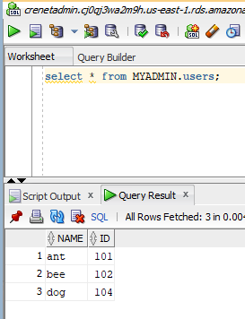 | create table MYADMIN.users ( name varchar2(15), id number(10) ) tablespace myspace; create table MYADMIN.lessons ( id number(10), lessons varchar2(15), day varchar2(15) ) tablespace myspace; insert into MYADMIN.users (name, id) values ( 'ant', 101 ); insert into MYADMIN.users (name, id) values ( 'bee', 102 ); insert into MYADMIN.users (name, id) values ( 'dog', 104 ); insert into MYADMIN.lessons (id, lessons, day) values ( 101, 'math', 'monday' ); insert into MYADMIN.lessons (id, lessons, day) values ( 102, 'art', 'tuseday' ); insert into MYADMIN.lessons (id, lessons, day) values ( 103, 'music', 'friday' ); insert into MYADMIN.lessons (id, lessons, day) values ( 105, 'exec', 'sunday' ); |