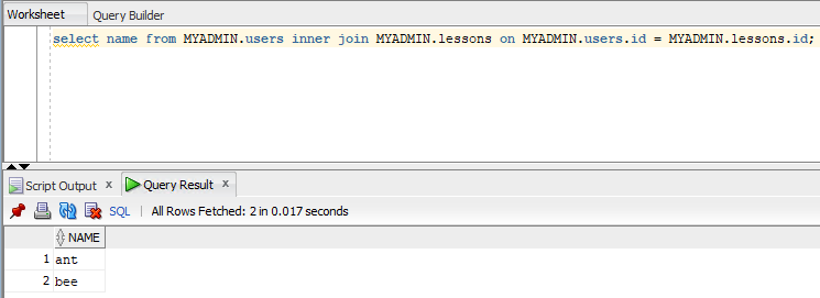 select name from MYADMIN.users inner join MYADMIN.lessons on MYADMIN.users.id = MYADMIN.lessons.id; |
