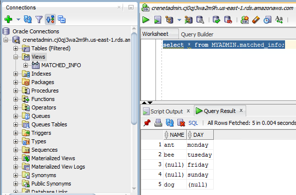 # create view create view matched_info as select MYADMIN.users.name, MYADMIN.lessons.day from MYADMIN.users full outer join MYADMIN.lessons on MYADMIN.users.id = MYADMIN.lessons.id;