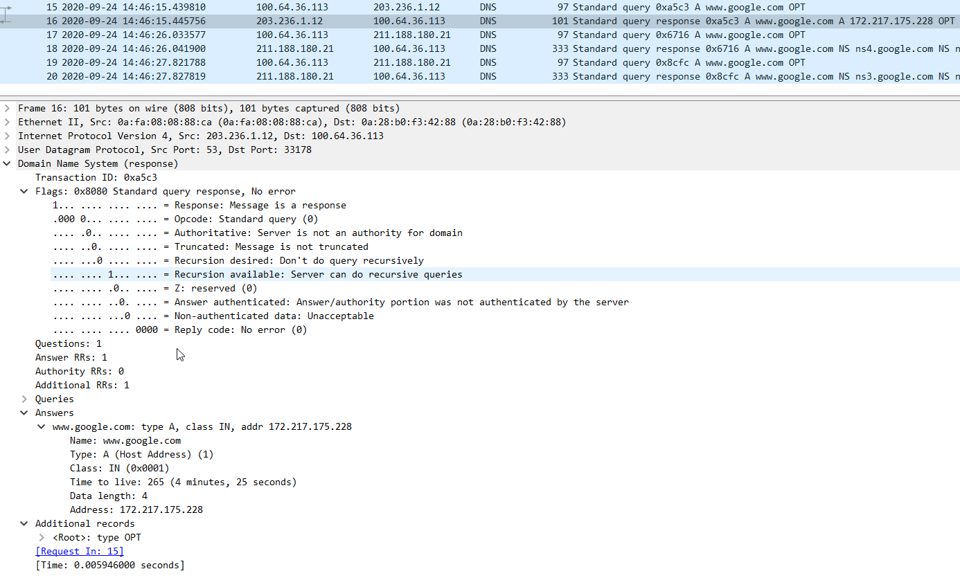 - In the response packet, Recursion Available is set. (The DNS can recurse)