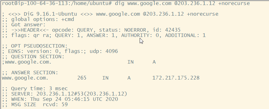 So far, I send recursive query. However, I want to see the same result with iterative query. In this post, I explained how to generate iterative query. I will use "dig +norecurse". Please note below