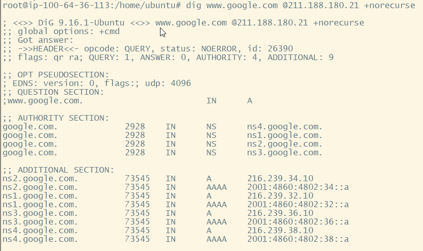 I have already told that different type of result can be shown with "norecurse" option. I will send query "www.google.com" to different DNS servers.