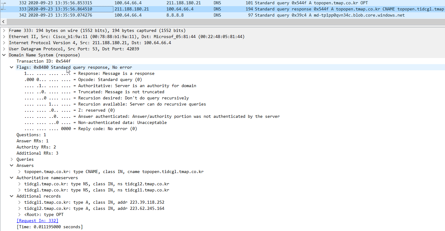 At first, Cached A record information is returned from DNS server. At this time, I can expect this DNS server has the cache. Please look at the next case,
