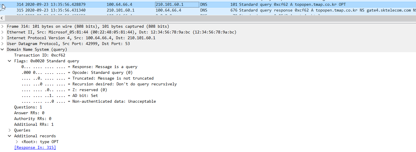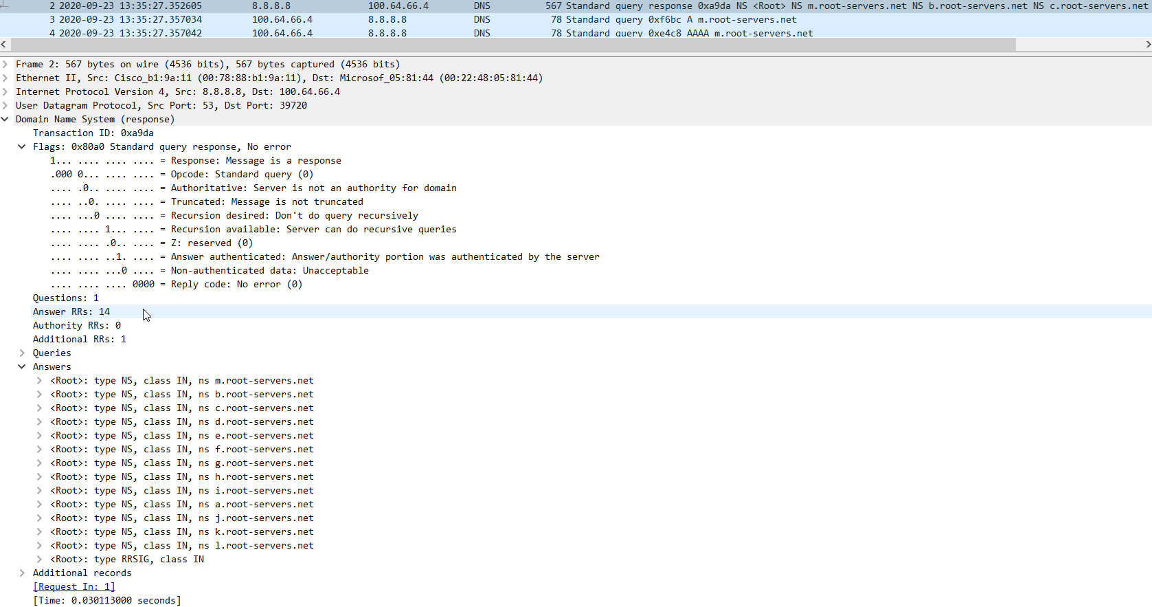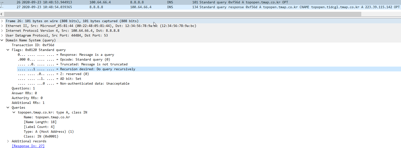 - In the response packet, Recursion Available is set. (The DNS can recurse)