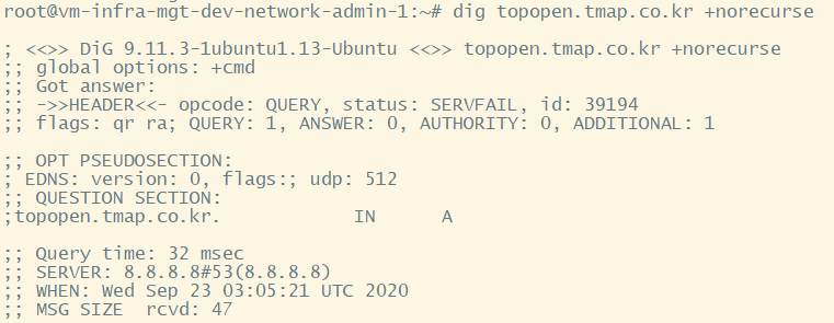There is no Answer field. There are next DNS server information to query. This is the reason why I do not recommend this norecursion option. Sometime, I can see the server fail like below.